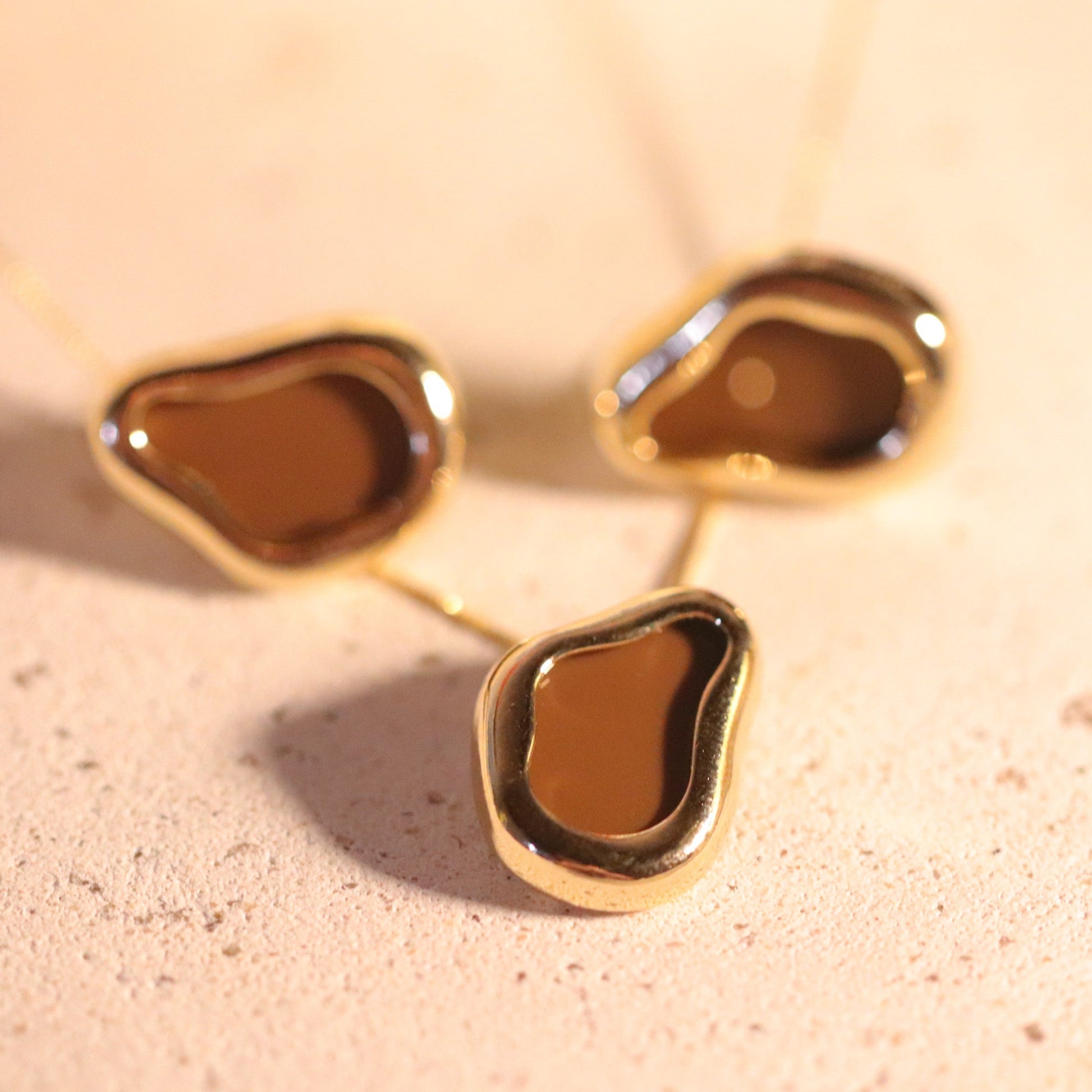 O colar é feito é produzido em metal nobre com acabamento em ouro 18k, e possui o centro do pingente em resina. O par de brincos possui 3cm, e é produzido em metal nobre com acabamento em ouro 18k, possui o centro em resina, conforme o modelo.
