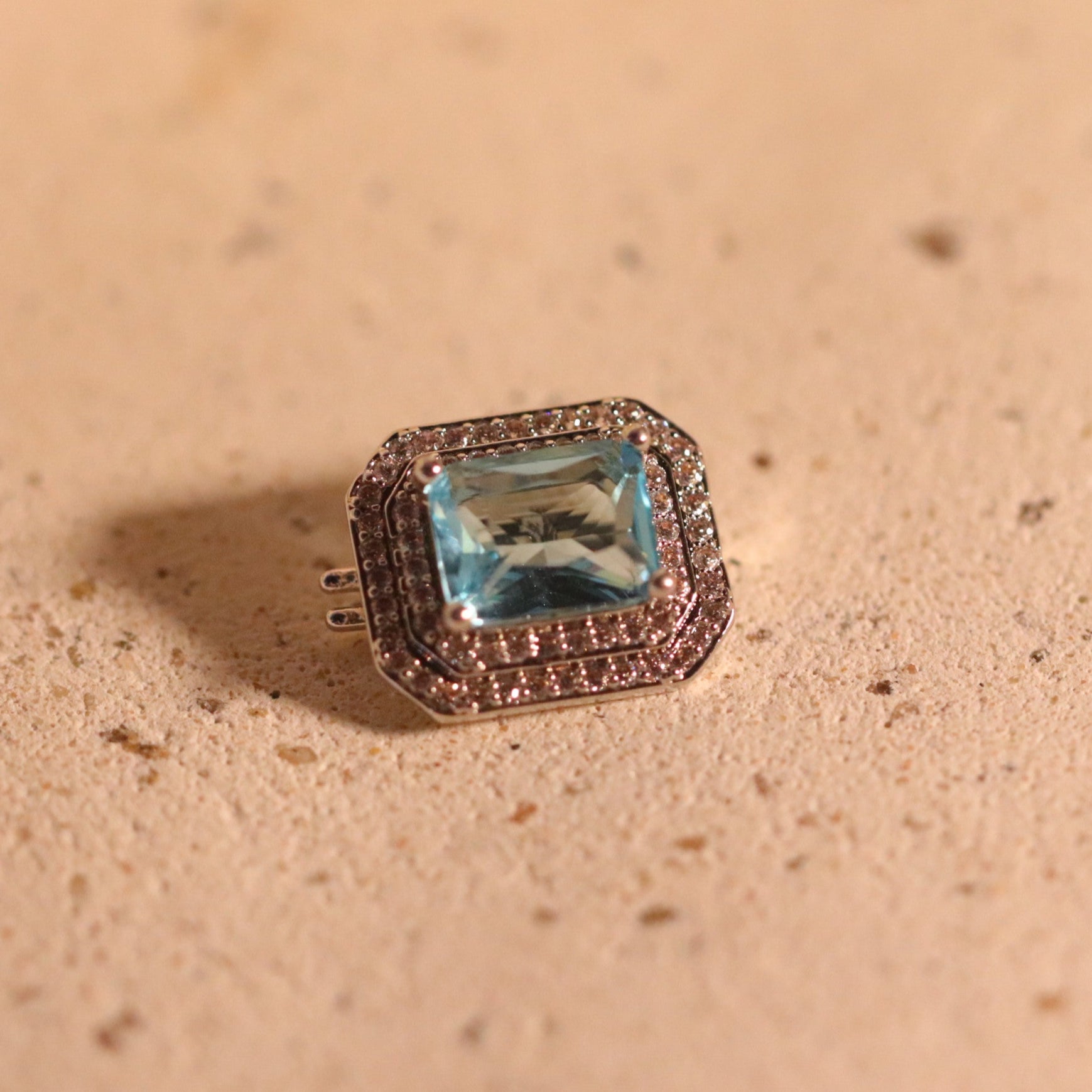 A peça possui aplicação de zircônias ao redor, com uma zircônia central azul, conforme o modelo.